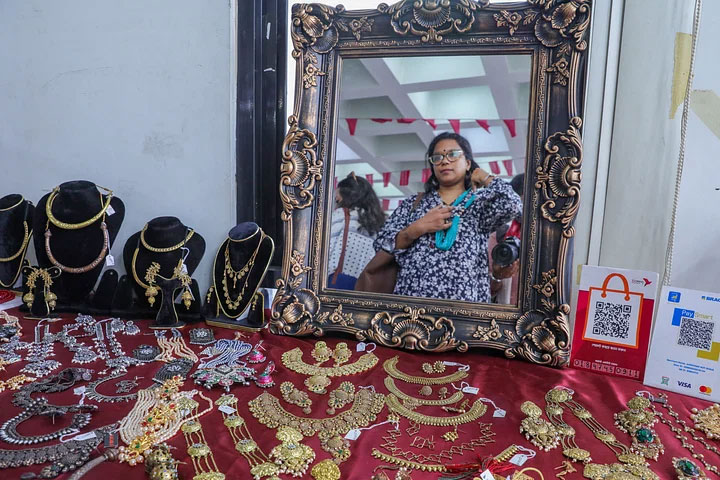 • গয়না গলায় পরে দেখে নিচ্ছেন এক ক্রেতা।