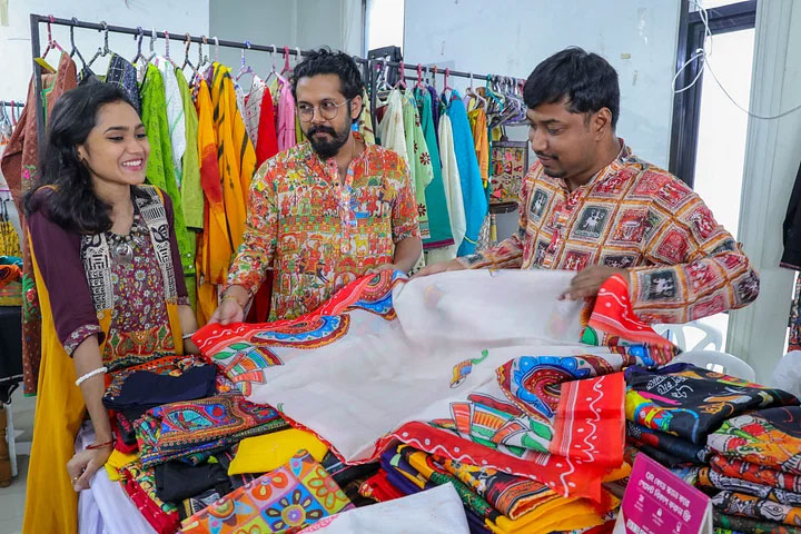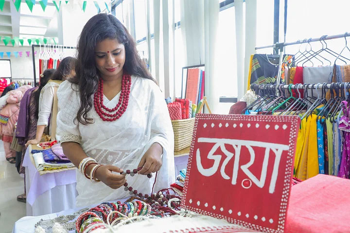 • দেশীয় নকশায় মালা শাড়ি রয়েছে জায়া নামের স্টলে।