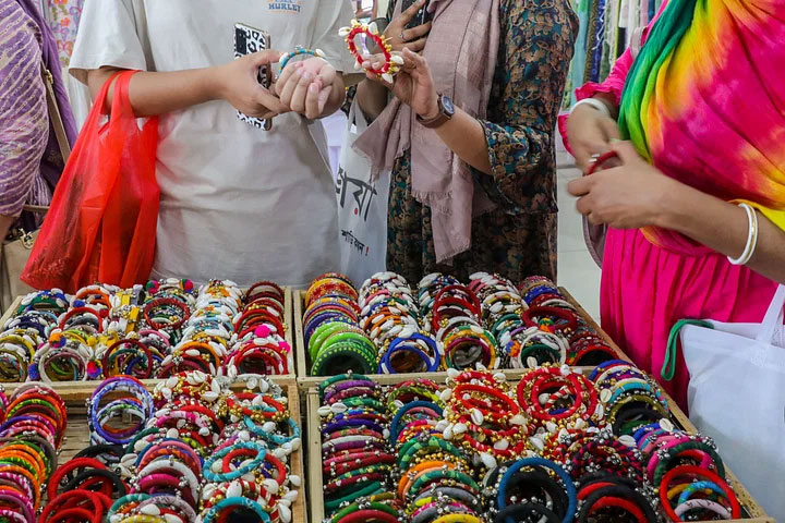 • বাহারি চুড়ি বাছাই করে কিনছেন তরুণীরা।